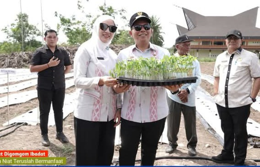 GARONGGANG WAHANANEWS,CO. Palas- Bupati Padang Lawas (Palas) Putra Mahkota Alam Hasibuan bersama Ketua PKK Kabupaten Palas Ny. Mahzalena Putra Mahkota Alam Hasibuan menanam cabe merah di lahan pertanian samping Kantor Bupati Palas. Kamis 23/10/25).